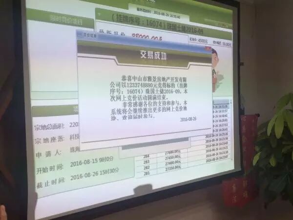 8月26日下午16:38分,經過292輪競價,中山市雅景房地產開發有限公司以12.337億奪得珠海唐家灣地塊!編號2016-09的唐家灣地王宗地面積為46933.8平米,容積率大於1.0且小於等於2.0,建築密度小於等於25%,綠化率大於等於30%,起始樓面地價4580元/平米,成交均價28000元/平米,溢價率約為511.35%!據瞭解,這一地塊的樓面均價已經超越同日拍出的廣州黃埔地王的27274元/平米。